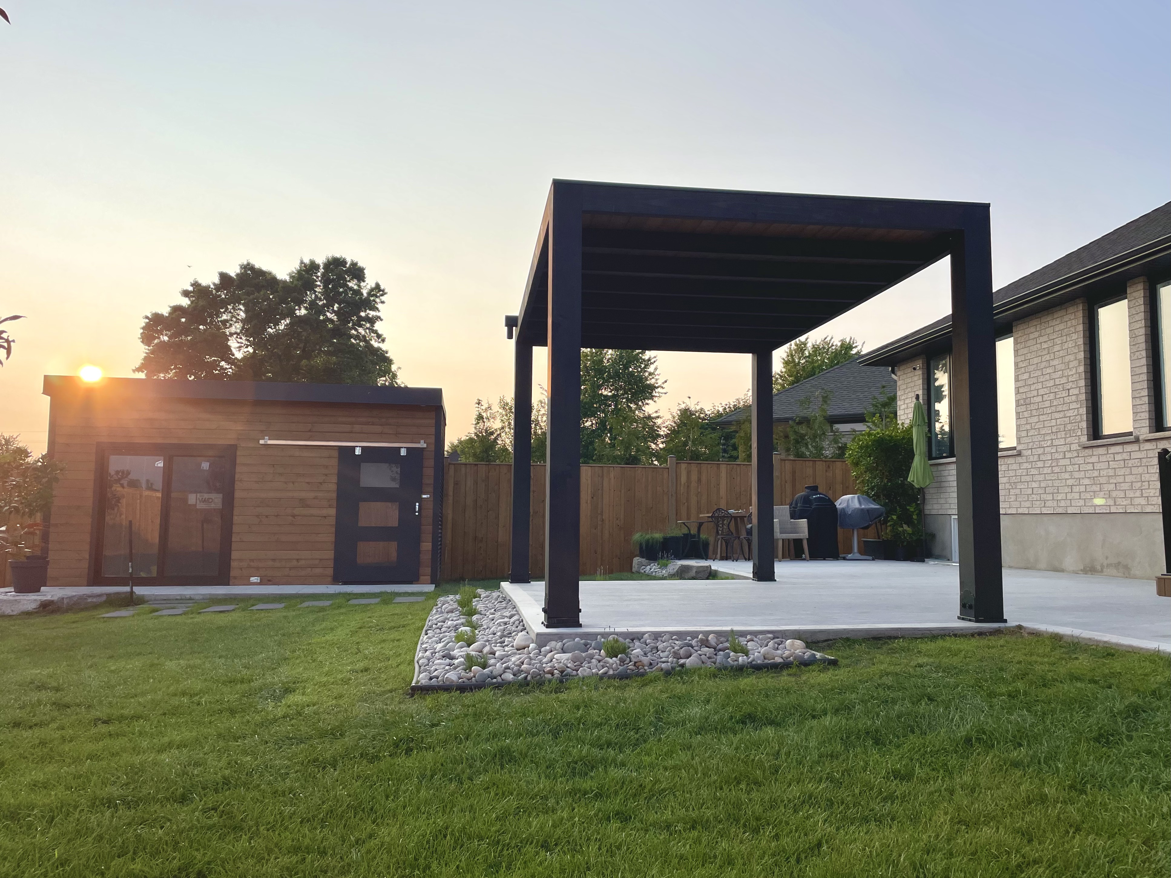 Our Pergolas have been designed with the same core principles as our studios. Each Modern Pavilion Series structure is built using architectural grade materials selected for durability, appearance, and long term performance in Canadian conditions. Douglas Fir posts are commonly used for their strength and natural warmth, most often finished in Muskoka Brown, a colour that complements the wood grain and surrounding landscape. Other finishes and colour options are available by consultation. The perfect escape for you and your family. From start to finish we want the design and installation process to be as enjoyable and stress-free as possible. That's why the prefabrication process we've developed makes for less time on-site, shorter lead times, and scheduling around other trades a breeze.