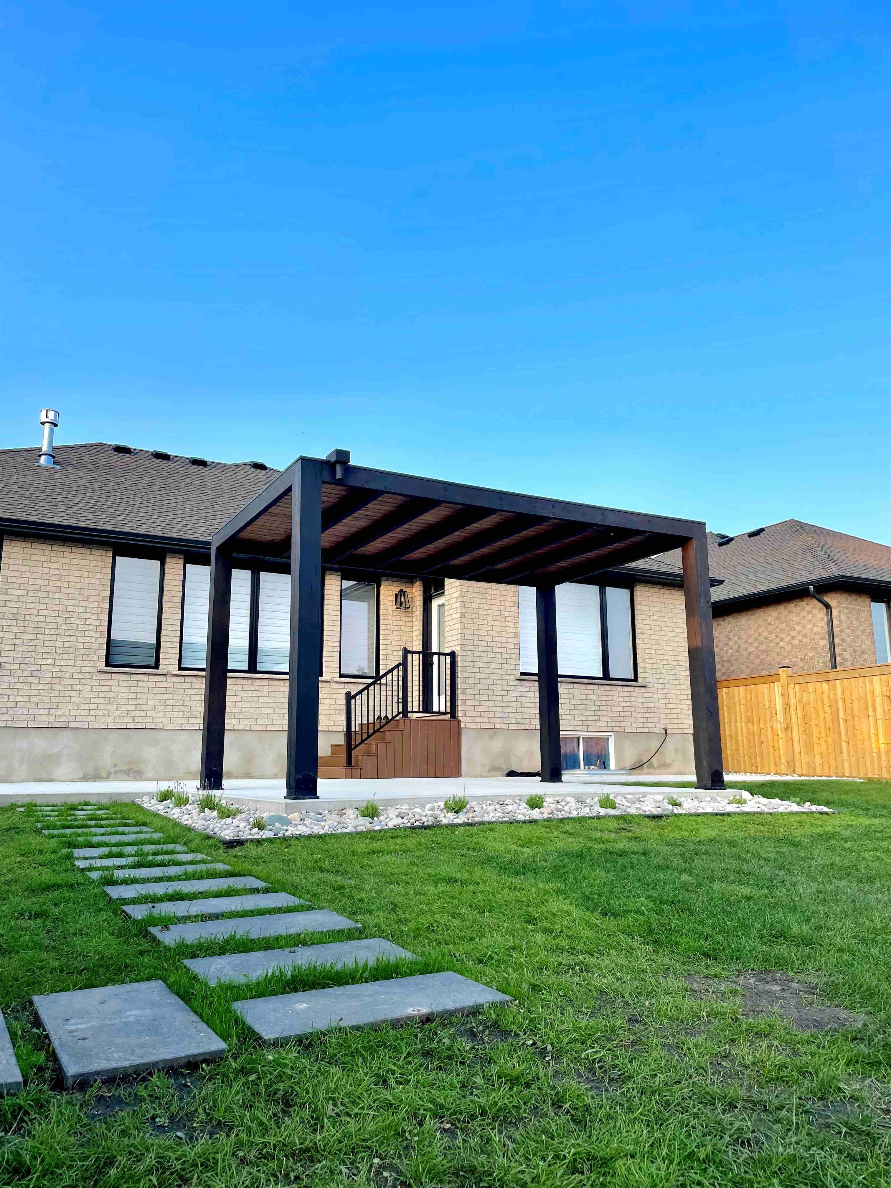 - Architectural grade Douglas Fir support posts Selected for strength, stability, and natural warmth, commonly finished in Muskoka Brown to complement modern landscapes..