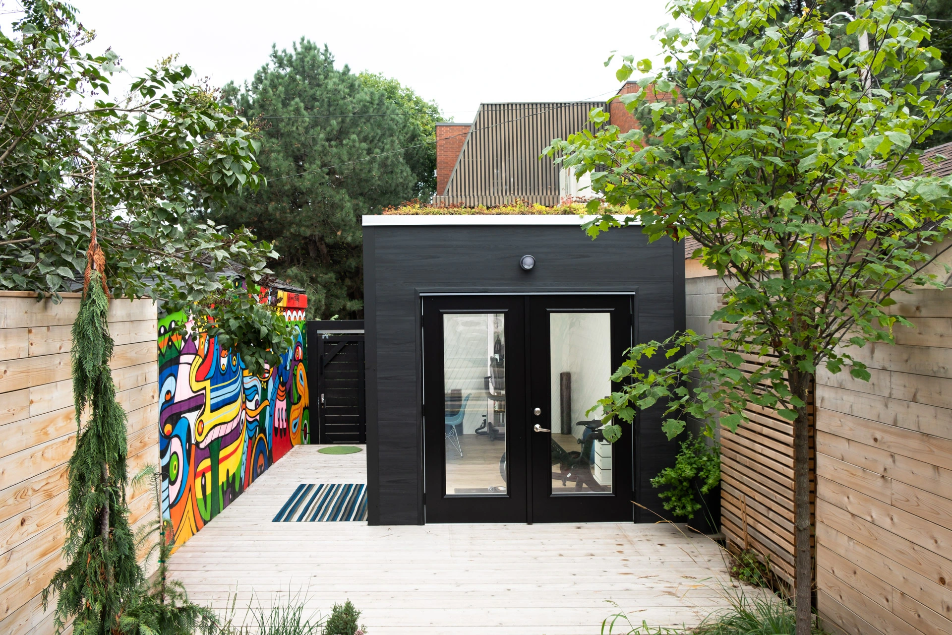 The cube has long been a favorite of our customers who are looking for a more industrial design. The sharp lines, boxy shape, and Chamclad siding make this unit feel at home in the concrete jungle of downtown Toronto. Our clients were eager to add a splash of life and colour to the alleyway and our eco-roof was the clear choice. The lush greenery livens up the space and complements the beautiful mural they've had painted in the walkway into their backyard. They managed to brighten up the interior significantly by adding a set of full-lite French doors, an 8' wide patio door and a 5'x3' sliding window towards the back. Facing the entrance and main windows towards the house helps this space feel more like an extension of their home rather than a rented office in another building.